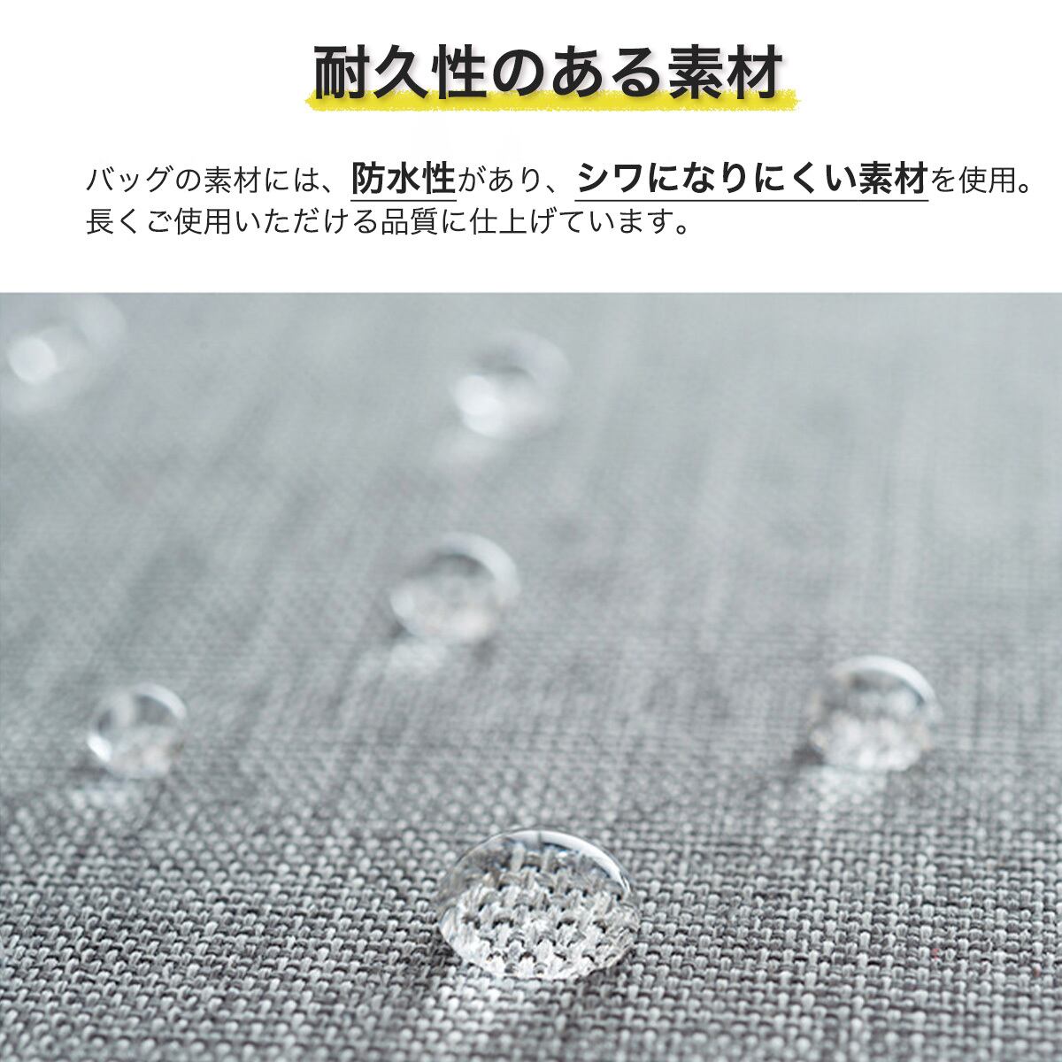 ・素材は防水(はっ水)加工がされており、中身をしっかりと保護するとともに、中身が一目でわかるメッシュ素材を使用。