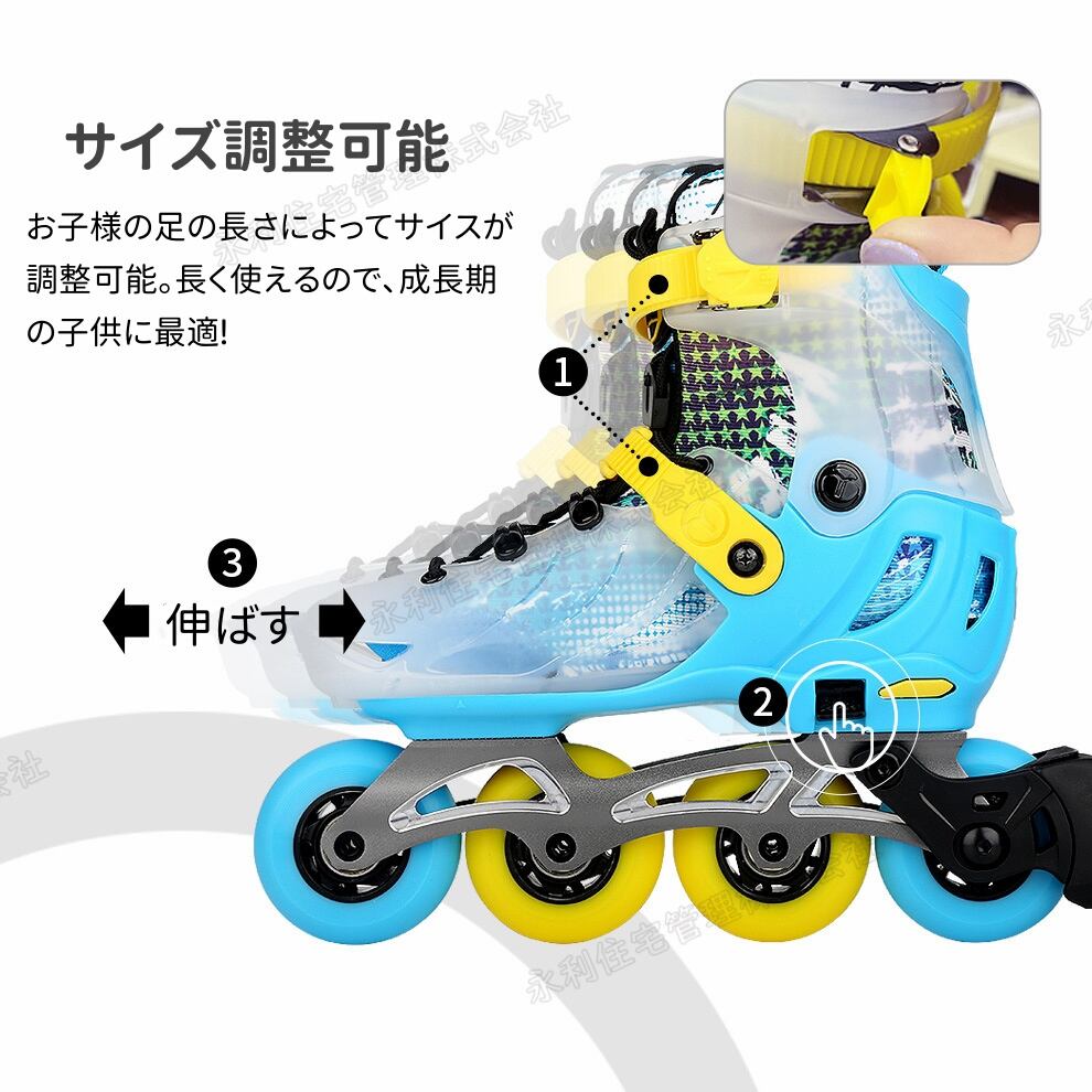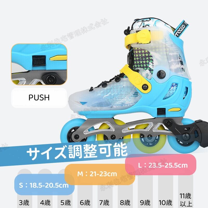 当社のインラインスケートはS(18.5-20.5cm)、 M(21-23cm)、 L(23.5-25.5cm) 三種類のサイズで、お子様でも楽々のプッシュボタンで簡単サイズ調整可能なフレーム 子供の成長に合わせてサイズ調整ができるので、足にもしっかりフィットし、長く使えるのでとてもです。成長期の子供に最適!